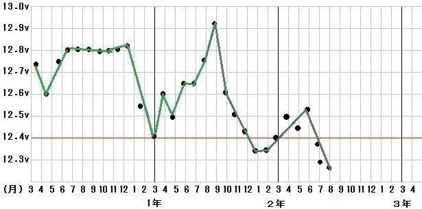 12.40vあればエンジン始動には十分なのでそこに赤線。12.30v台になるときつい。