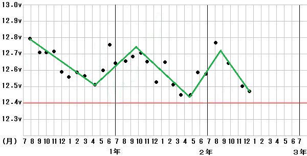 12.40vあればエンジン始動には十分なのでそこに赤線。12.30v台になるときつい。