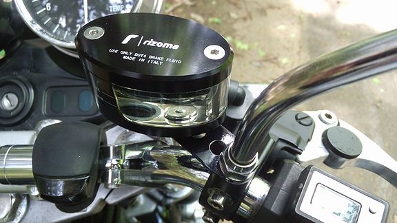 ニップルをフルードタンク本体に挿入、NISSINブレーキマスターの洒落っ気のない白タンクと交換、バイクに取り付ける。 ってことはもちろんフルード交換、エア抜きが作業として必要です。