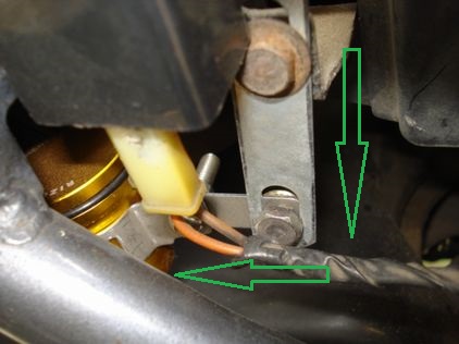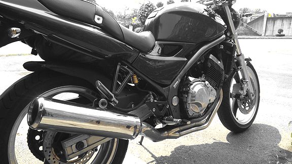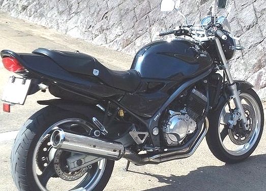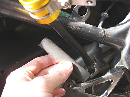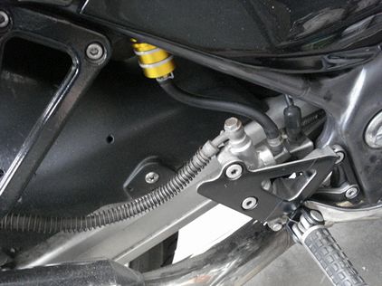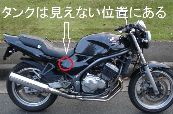 バリオスの場合、リアのフルードタンクはサイドカバーの裏、見えない位置にある。