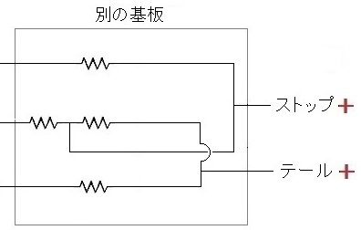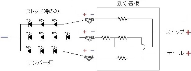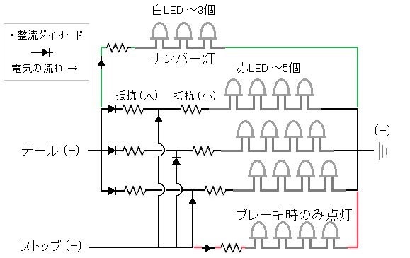 ▲ LEDテールの回路図の概要。 上の予備知識を踏まえるとこうなるね。
