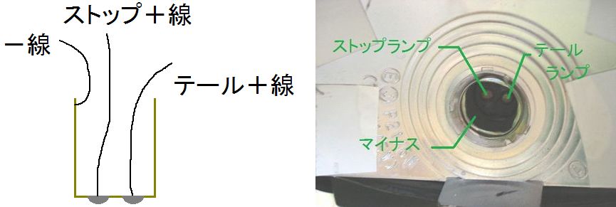 テールランプの時に通電する回路はテール(+)に、