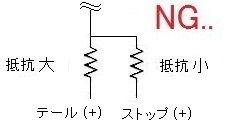 ※1. 厳密に言えば、テール(+)は常に電気が供給されるので抵抗Bの影響はゼロではない…が無視しても問題ないレベル。 でも(↓)のような回路だと話は別。