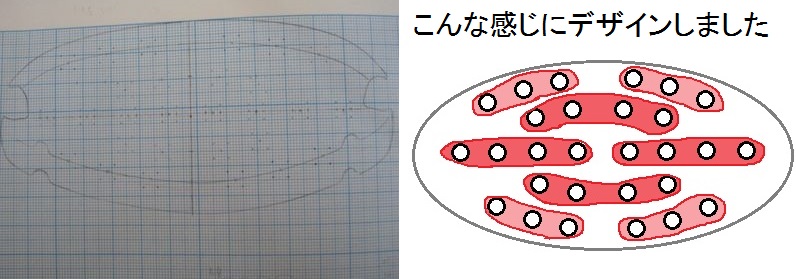 方眼紙の上でどこに5mmLEDを設置するか考える。赤色LEDは最大5個並びの直列で一組。それを考慮してデザイン。