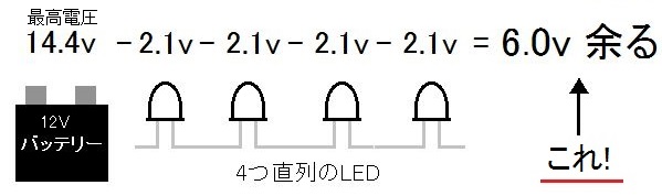 それを踏まえると直列にするLEDは、白なら2個まで、 赤なら4個までがいいかと思う。