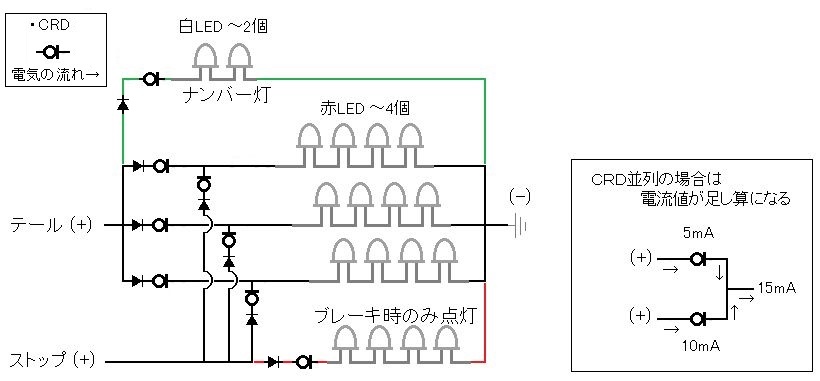 ・ブレーキ時もテール(+)は電気が供給されるのでCRDが並列接続になることに注意。