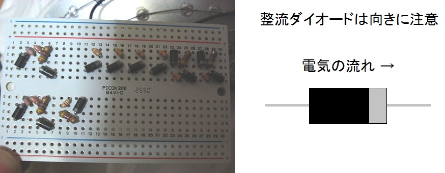 整流ダイオードは向きに注意。