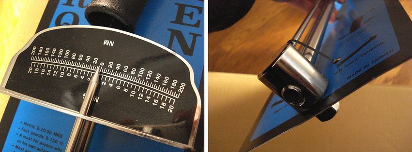 んで、見てのとおり、ラチェット式ではないので使い勝手はやや悪い。でも最後のギュッと締め付けるときだけこのトルクレンチを使えば良いだけなのでほぼ問題ない。