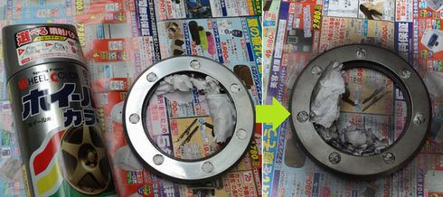 という事でホイールカラーでマットブラックに塗装。 つるつるの面が梨地になって表面積UP、貼り付きも良くなるはず。