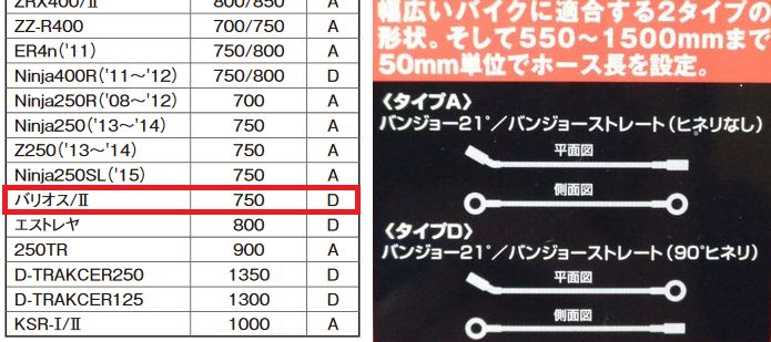 このホースには、2つのバンジョーにひねりの無いタイプA、90度ひねってあるタイプDの2種類がある。