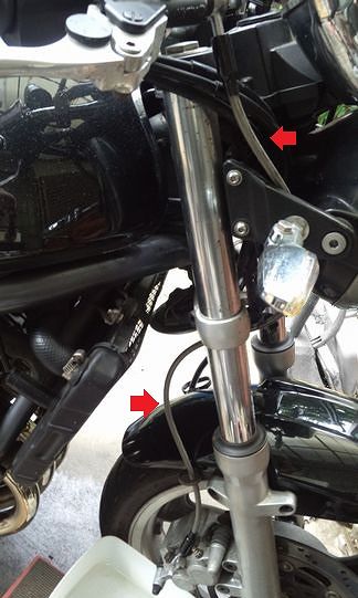 メッシュホースは硬いので長くする事でサスの伸縮時の負荷に対応している。これはどうしようもない。