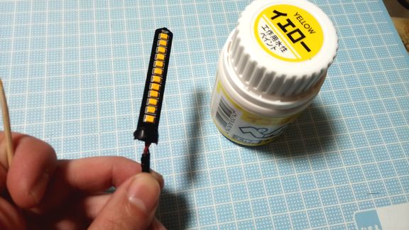 試行錯誤の結果、LEDに黄色い塗料を乗せて輝度を落とす方法が一番良かった。 ダイソーにあるアクリル塗料。 塗るのも剥がすのも簡単。塗り重ねて明るさを落としたぞ。