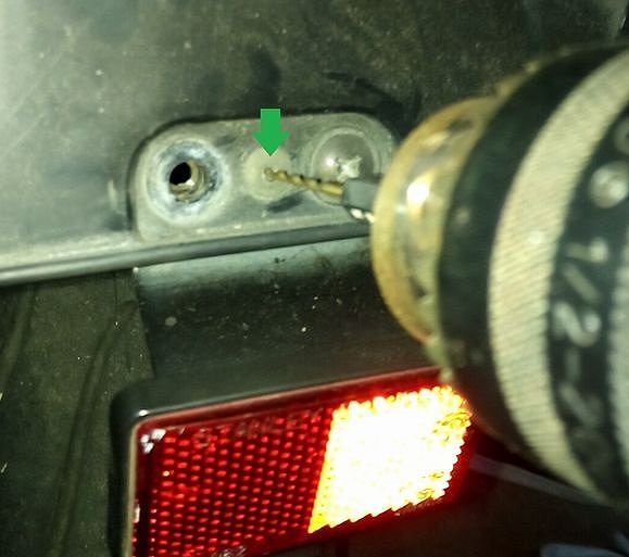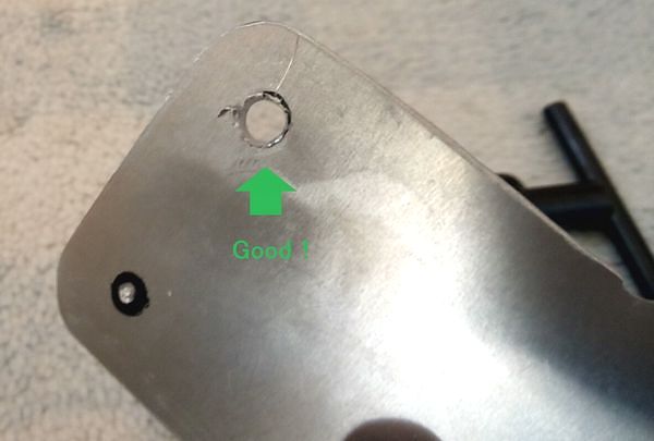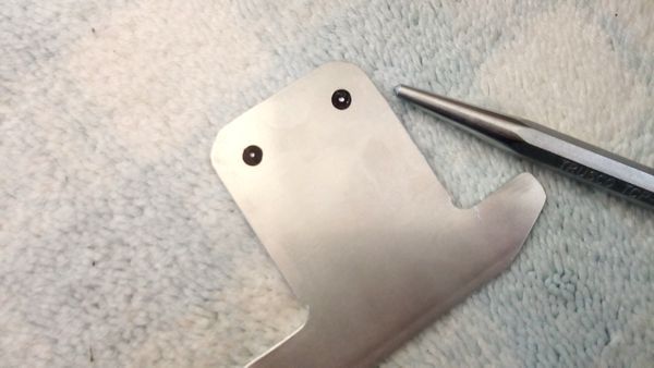 車体にあてがい、ペンでネジ穴をかたち取る。 ドリルの先端がブレないようポンチ!