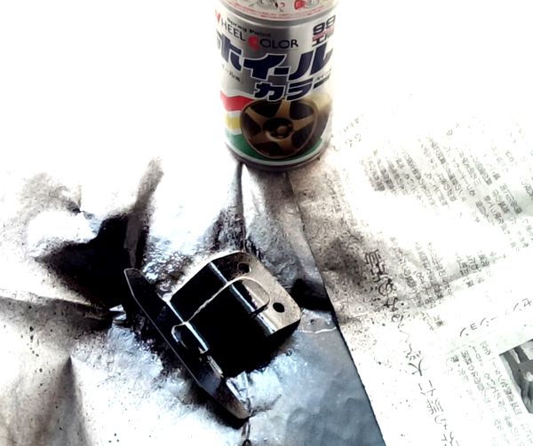 ステーを黒に塗装。 ホイールカラーなら下塗り要らずで密着する。 表は艶ありで塗装しようっと。
