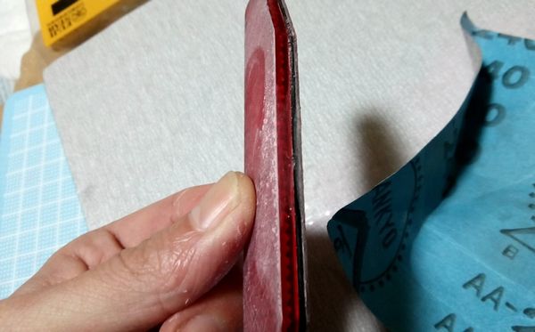 削ったらいらない文字やフチ取りがきれいさっぱり! 使用したのは空研ぎペーパー240番。