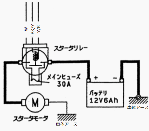 するとスターターリレー内の電磁石に通電(BK/Y、Y/R線)し作動、