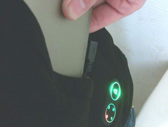 電源端子はUSBタイプA。 左ポケットの中。 バッテリーに接続したらポッケにIN。