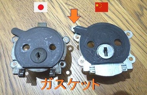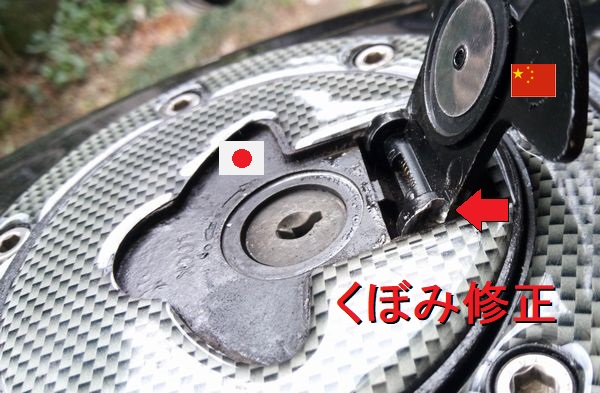 中国製の鍵穴キャップは付け根あたりが純正に比べわずかに幅広。