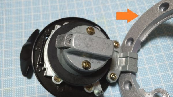 純正タンクキャップに中国製シャフトは物理的に移植不可なので純正シャフトを使用する。しかしこれが中国製の鍵穴キャップには太すぎる。