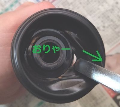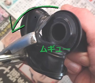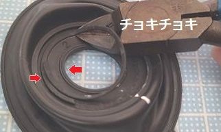 全周をバルブ側に入れるとほぼ勝手に奥まではめ込まれる。中途半端にはまった部分(写真矢印)は押し込めばOK。