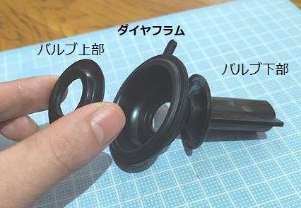 ダイヤフラムのはめ込み部分を引っ張り上げ、バルブ側の隙間に入れて、組み立て完了!