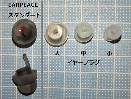 上はEARPEACEのスタンダードサイズ と 集音器のイヤープラグ大・中・小。