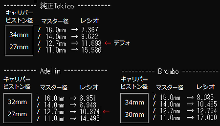 キャリパーピストンφ、マスターシリンダーφ、 それぞれの"面積の比率" (※) でブレーキの感覚は変化する。