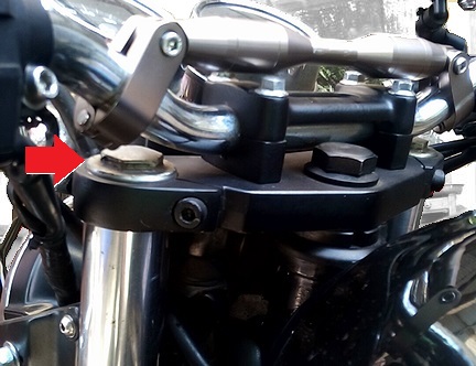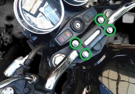 まず、ハンドルクランプの4本のボルトを10mmレンチで外し、ハンドルを上にでもずらす。