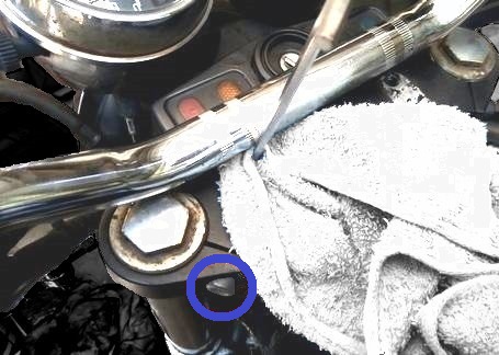 フォークの蓋、フォークスプリングシートを外す のだがハンドルが邪魔になる。