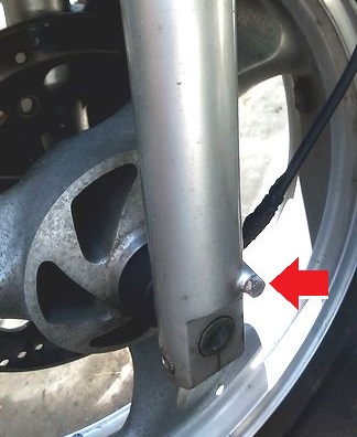 オイルを抜くのは フォーク下部のドレン。 10mmレンチで外す。
