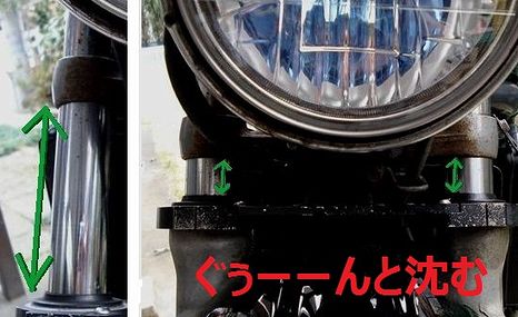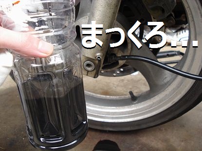 ジャッキアップせずに両側のフォークオイルを抜くとびっくりするほどフロントが沈む! 押さえてないとバイク倒れるっっ!