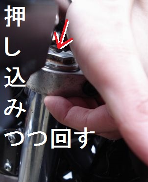 フォークホルダーアッパーのボルト、六角レンチ 6mmで。 ここは緩めるだけ。