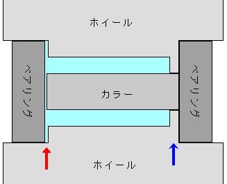 赤い矢印の方(車体左側)は カラーに接触しない程度の隙間を作る必要がある。
