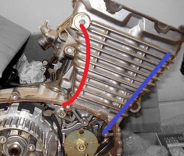 カムチェーンガイドは2本。上の赤いラインの所と青いラインの所に存在します。