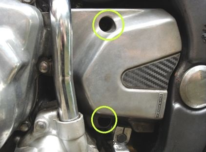 8mmのT型レンチなどを使ってチェーンカバーの2箇所のボルトを外す。