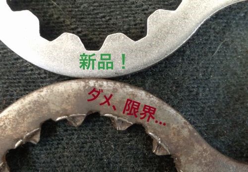 磨り減ってくるとチェーンとの噛み合いが悪くなり、パワーロス、雑音の原因に。