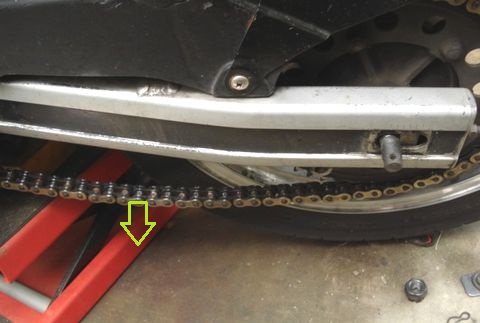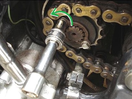 再びギアをNに、 スプロケにドライバーを噛ませて後輪を回せばチェーンが外れる。