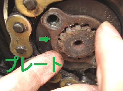 ここまで摩耗するとプレートを外さなくても引っ張るだけでスプロケが抜けてしまう。構造上、走行中に抜けてしまう事は多分ないと思うが。