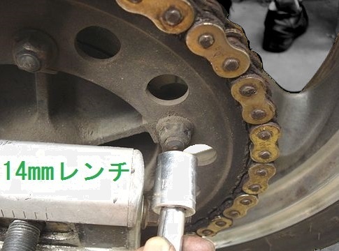 14mmのレンチでリアスプロケットを固定しているナットを緩める。