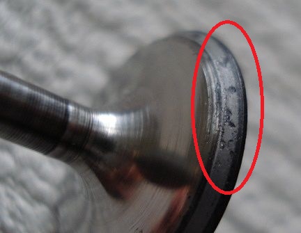 バルブすり合わせ作業に入った所でカーボン噛みによる凹み(打痕)を発見…。