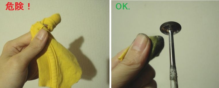 作業時の注意点、布を使った磨きは巻き込みの危険があります!