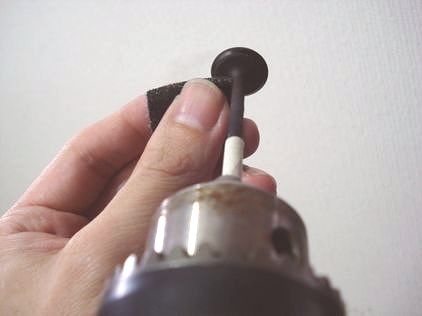 左手で紙やすりを持ち、右手でドリルを操作、というラフなスタイル。