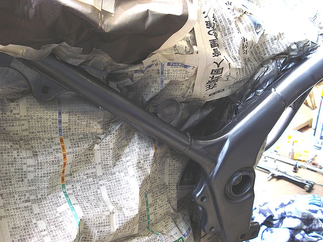 新聞紙、マスキングテープで 塗装するフレーム部分以外はマスキング。