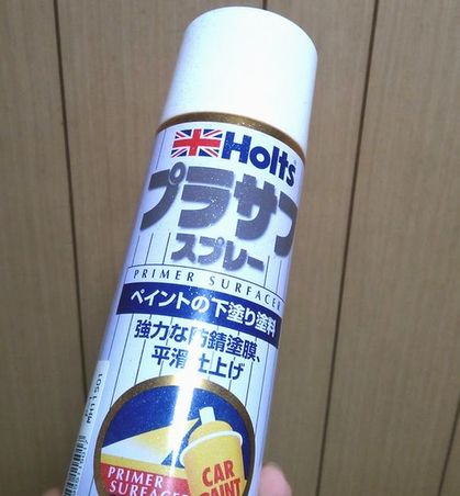下地には"プラスチックプライマー"を吹き付けた。 ソフト99 バンパープライマー(amazon)と成分はたぶん同じ。どちらも樹脂への塗料の密着を高める下塗り塗料。
