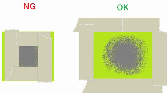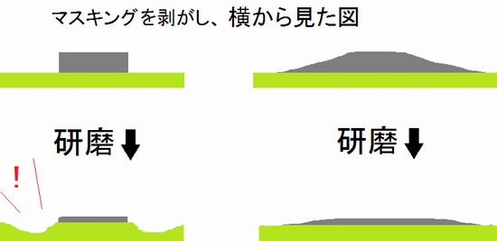 余裕の無いマスキングで塗装すると、塗装した部分と周辺の塗装面に極端な段差ができてしまう。 これを周辺の塗装面と段差が無くなるように研磨するわけだがこれが難しい。いつまでもシュコシュコしてると削らなくていい部分が削れてしまう。