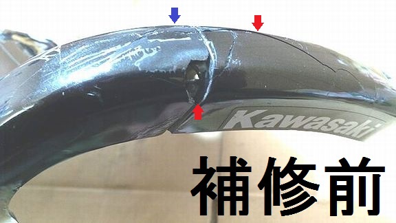 ヒビは接着、裏から補強する。 表面の凹凸はバンパーパテで整える。