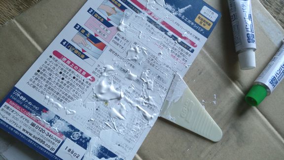 程よい硬さ、滑らかさ。 作業性はかなり良さそう。 しかし 硬化時間20分と結構早い。 作業は滑らかなうちにささっとやろう。