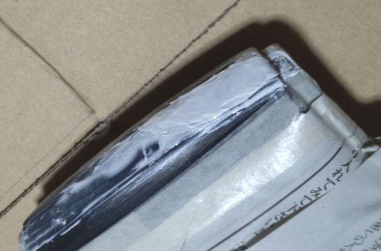 このパテは乾くと少し痩せます。埋めたつもりのヒビはパテが乾くとまた凹んで見えてしまう、盛り直したのが上の写真。 ヤスリの番手にもよりますが削るのは簡単です。