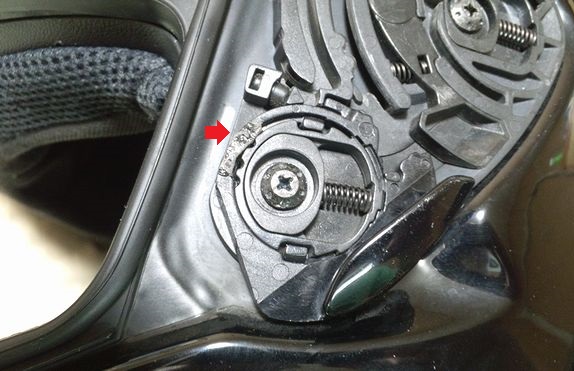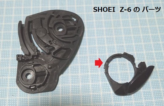 ヘルメットSHOEI Z-6のシールドの付け根のパーツ。問題はシールドをロックしたりデフォグポジションにするためのレバー。