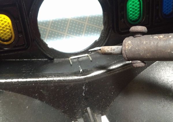 結束バンドと部品を溶かし接着しました。 さらにホッチキスの針で補強、結束バンドを溶かして覆い隠そう。